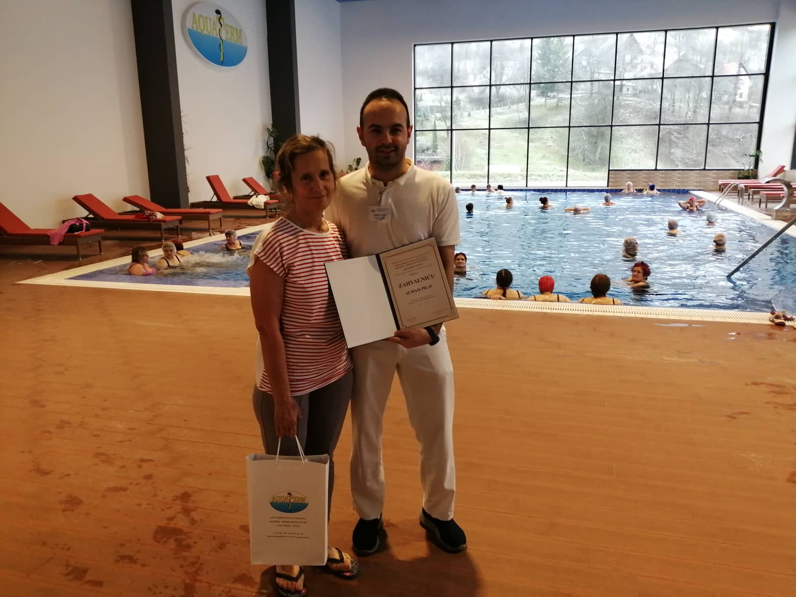 Početkom 2018. godine na račun JZU AQUATERM stigla je prva i vrijedna donacija od gospođe Almase Pilav za izgradnju zatvorenog terapijskog bazena što će se na kraju ispostaviti i jedina donacija prilikom izgradnje bazena. Trenutno je gospođa Pilav gost naše Ustanove te joj je uručena zahvalnica i prigodan poklon za njen doprinos u realizaciji investicije. Još jednom se zahvaljujemo Almasi Pilav i želimo joj ugodan boravak u našoj Ustanovi.