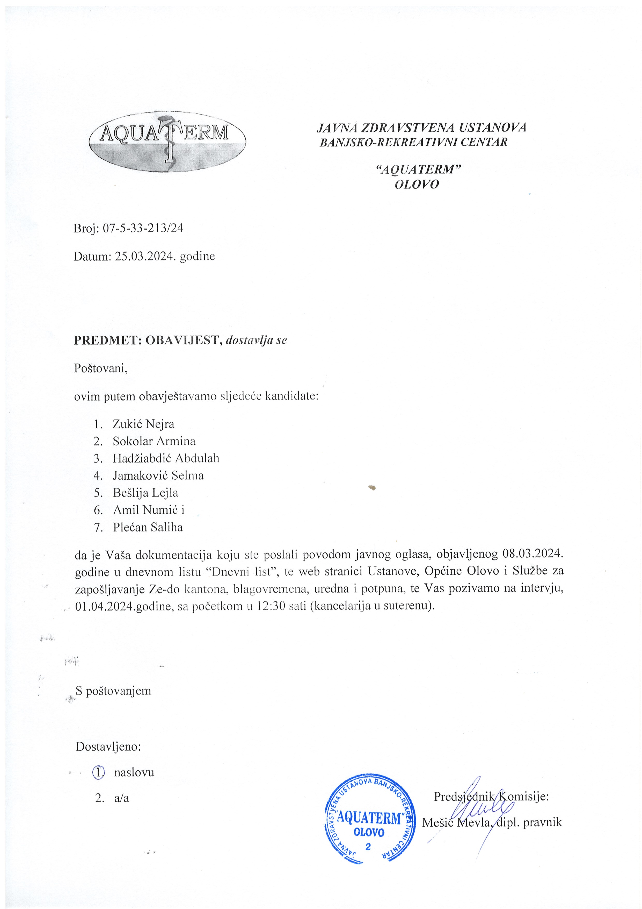Na osnovu člana 20a. Zakona o radu ( «Službene novine F BiH«, br. 26/16, 89/18 i 44/22), Uredbe o postupku prijema u radni odnos u javnom sektoru u Zeničko-dobojskom kantonu („Službene novine Ze-do kantona“ broj: 9/23), člana 10. Pravilnika o radu JZU BRC „AQUATERM“ OLOVO, Pravila koja se primjenjuju prilikom zapošljavanja radnika broj: 137-12/19 od 17.12.2019. godine, saglasnosti Upravnog odbora broj: 01-33-123/24 od 22.02.2024. godine i 01-33-136/24 od 05.03.2024. godine, te odluke v.d.direktora broj: 02-1-33-137/24 od 05.03.2024. godine,