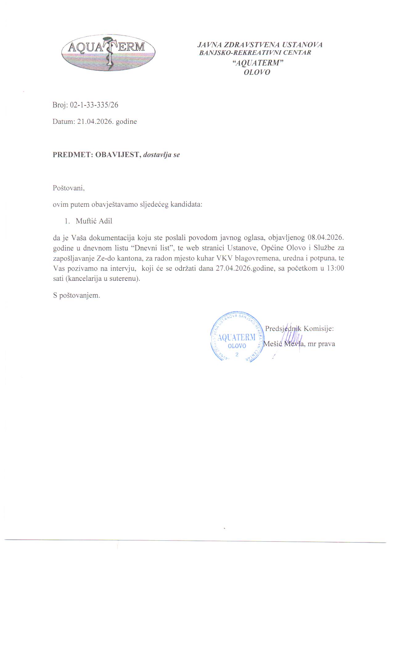 JZU BRC “AQUATERM” Olovo Branilaca bb 71340 Olovo, BiH Tel: +387 32 829 600 Fax: +387 32 829 601 aquaterm.recepcija@gmail.com